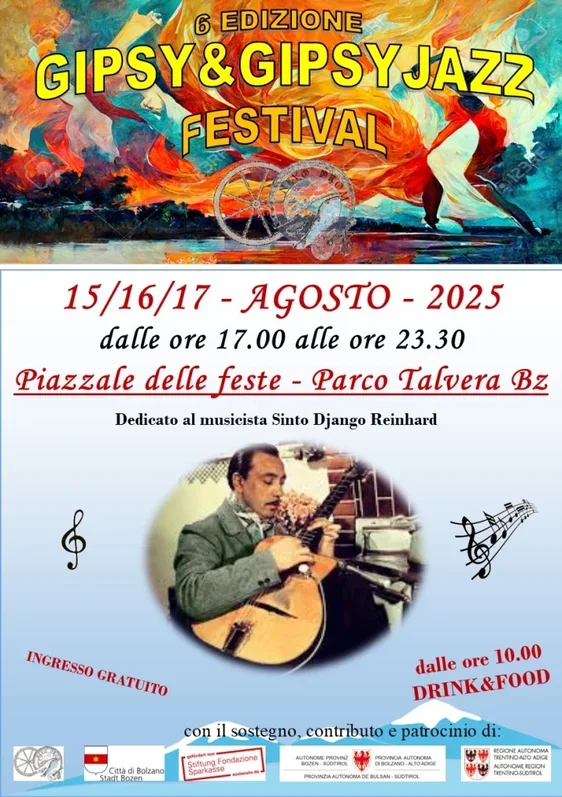 Das Gipsy&Gipsy Jazz Festival findet am 15., 16. und 17. August 2025 am Alexander Langer Platz auf den Talferwiesen in Bozen statt, ab 16.30 Uhr.